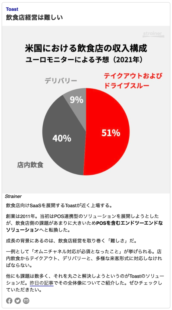 様々な経済メディアやサイトから届くメーリスDMのような物と違って、サイト上の情報に近いキュレーションされた”本当に役立つ情報”として毎朝手元に届くのは本当に便利に感じています。